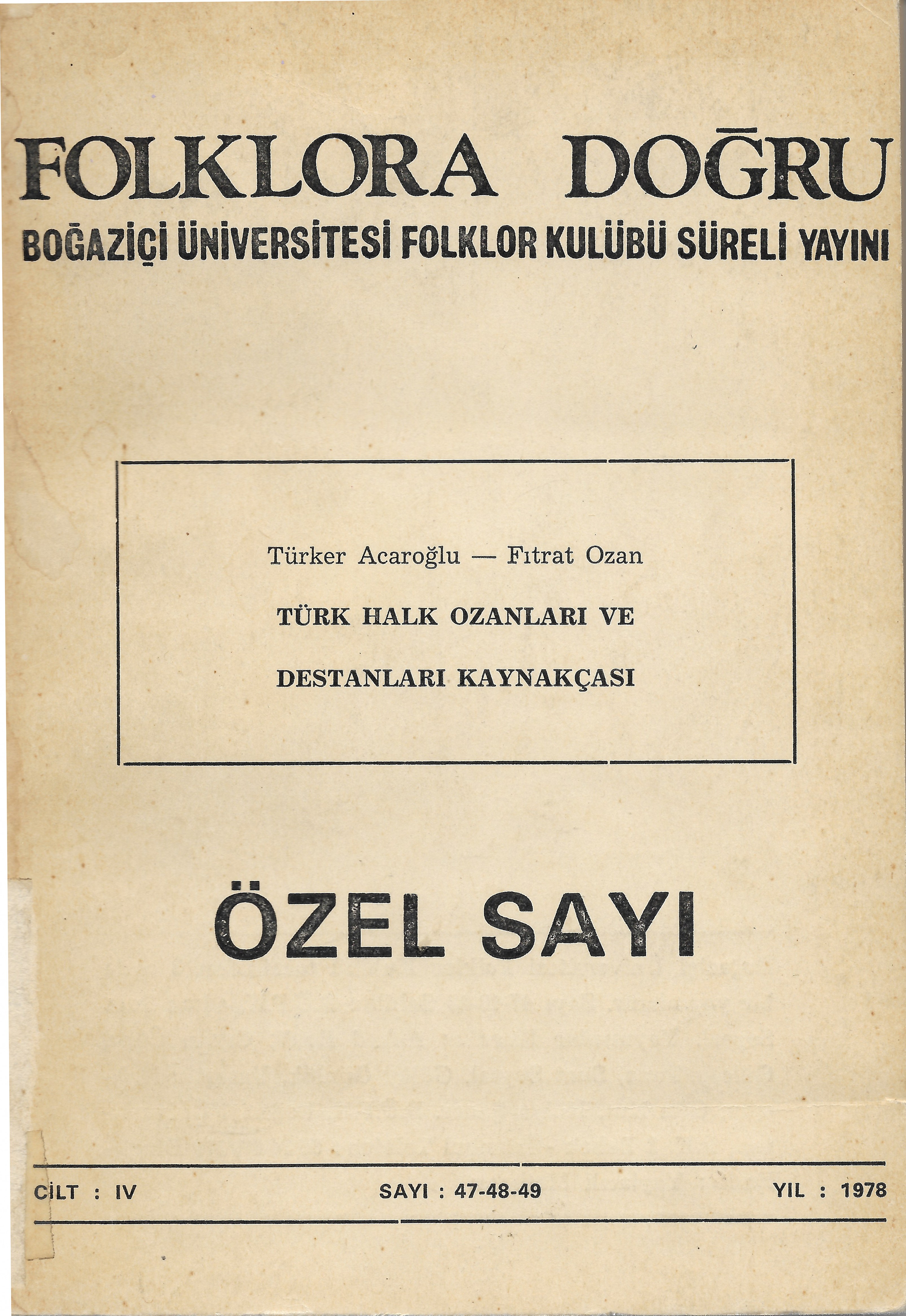 * Dergi Adı: Folklora Doğru * Basım Tarihi: 1978 * Cilt: 4 * Sayı: 47-48-49 * Not: Özel Sayı: Türk Halk Ozanları ve Destanları Kaynakçası (Türker Acaroğlu-Fırat Ozan) * Arşivimizde Mevcut Mu? : Var |