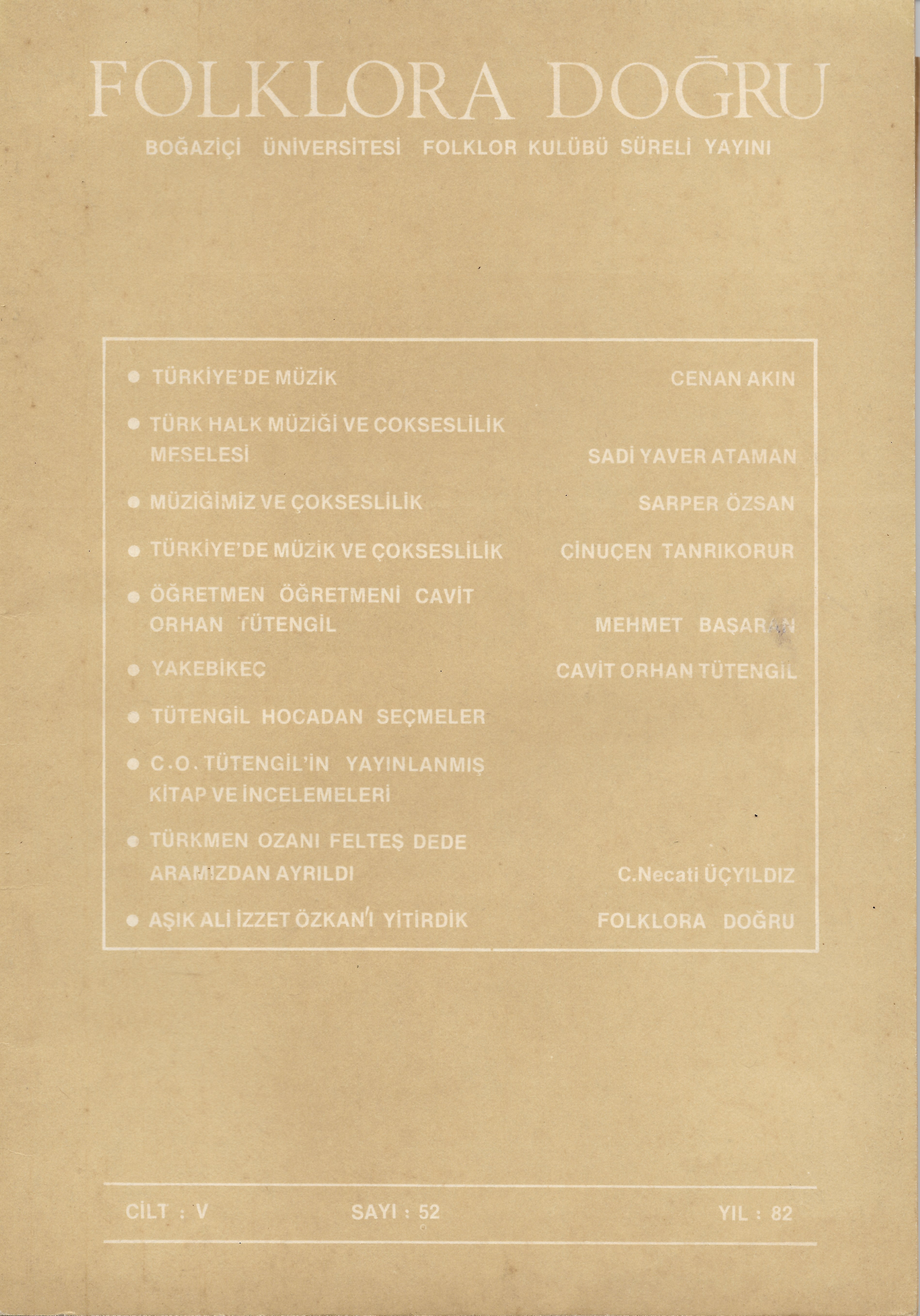 * Dergi Adı: Folklora Doğru * Basım Tarihi: 1982 * Cilt: 5 * Sayı: 52 * Arşivimizde Mevcut Mu? : Var |