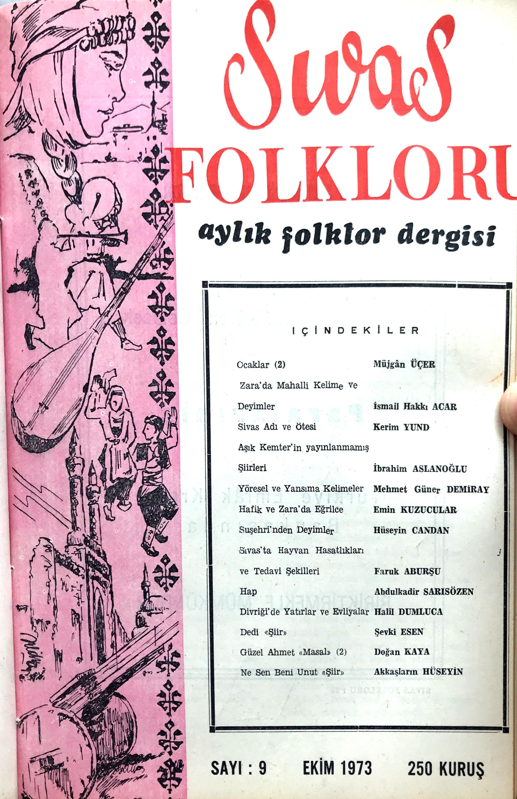 * Dergi Adı: Sivas Folkloru * Basım Tarihi: Ekim 1973 * Yıl: 1 * Sayı: 9 * Fiyat: 250 Kuruş * Derginin Sloganı: Aylık Folklor Dergisi * Arşivimizde Mevcut Mu? : Yok |