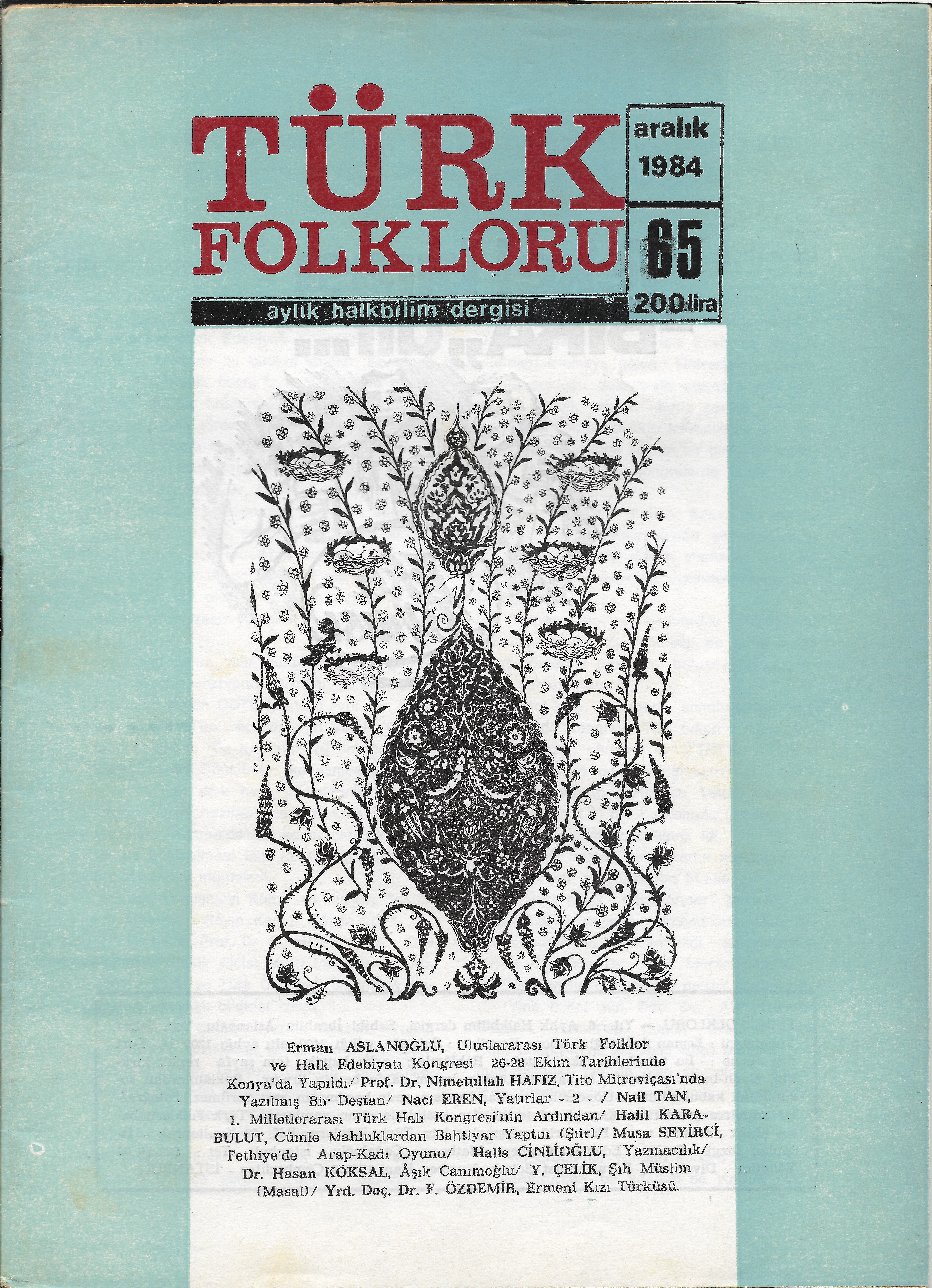 * Dergi Adı: Türk Folkloru * Basım Tarihi: Aralık 1984 * Yıl: 6 * Sayı: 65 * Arşivimizde Mevcut Mu? : Var |