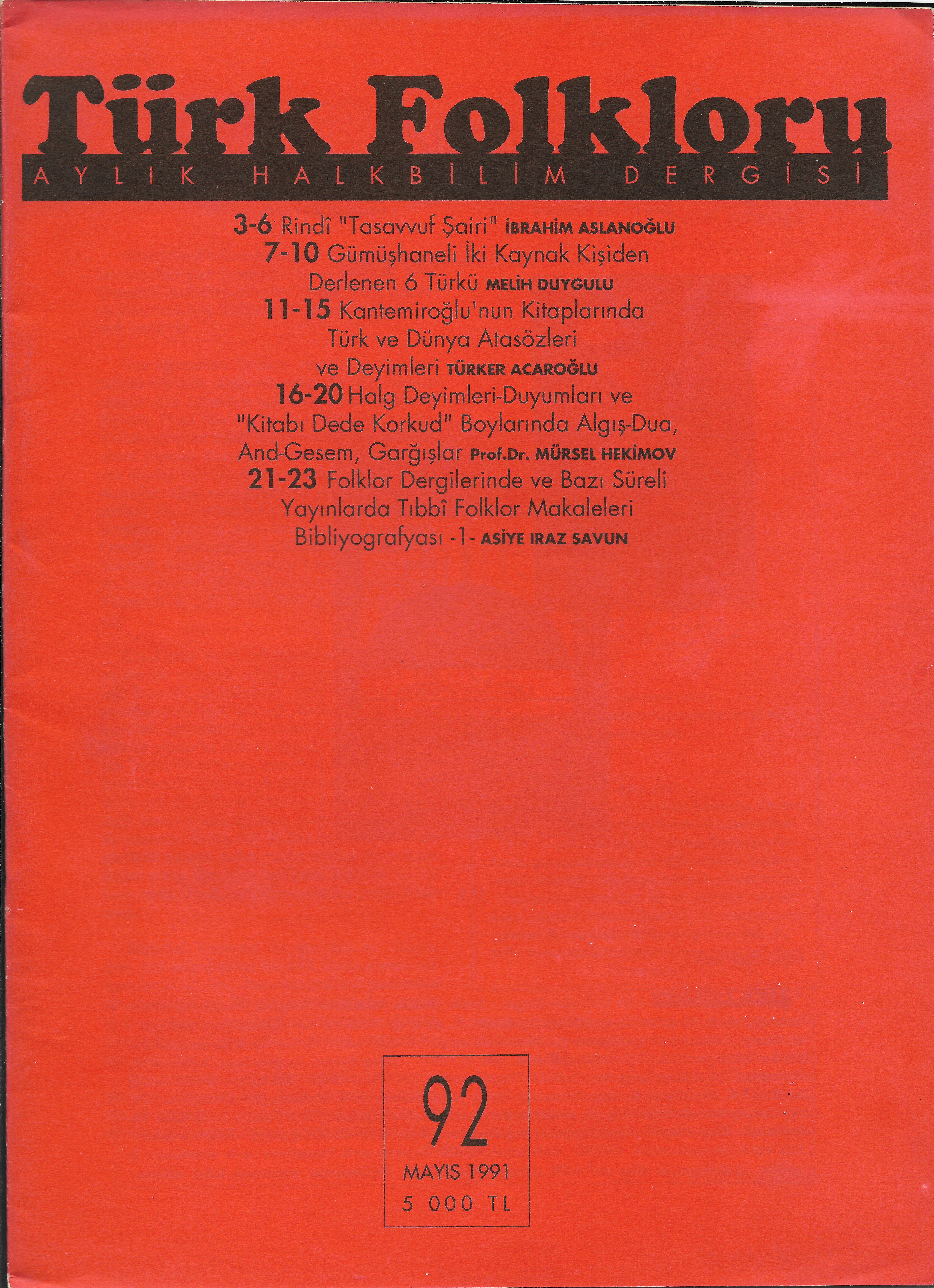 * Dergi Adı: Türk Folkloru * Basım Tarihi: Mayıs 1991 * Sayı: 92 * Arşivimizde Mevcut Mu? : Var |