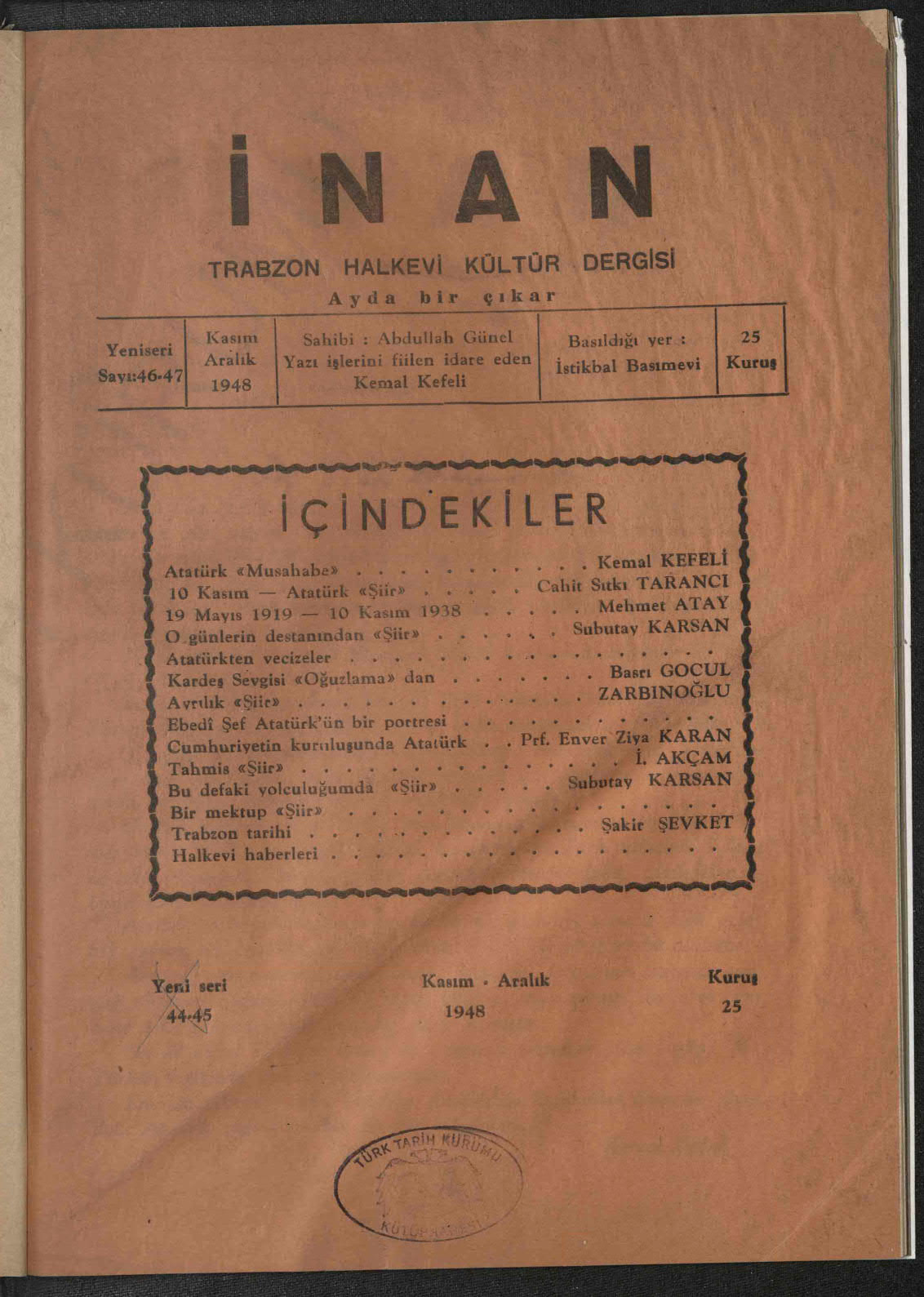 İnan - Yeni Seri (Trabzon Halkevi Dergisi)