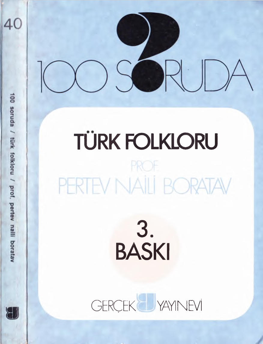 * Kitap Adı : 100 Soruda -Türk Folkloru * Yan Başlık : (İnanışlar, Töre ve Törenler, Oyunlar) * Yayınevi : Gerçek Yayınevi * Yazar : Boratav,Pertev Naili * Basım : 3 * Basım Yılı : 1994 * Basım Ayı : Ekim * Basım Yeri : İstanbul * ISBN : 975-7551-07-4 * Toplam Sayfa : 272 * Dizi Adı : 100 Soruda Dizisi * Dizi No : 40 * Kapak_Tasarımı : Sait Maden * Arşiv : Yok