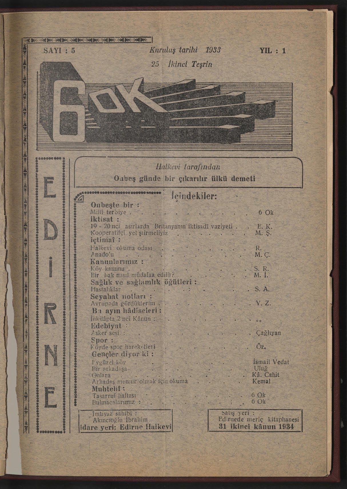 Dergi Adı: 6 Ok (Edirne Halkevi Dergisi)